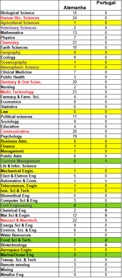 Pela negativa merecem destaque as áreas de universidades Portuguesas, marcadas a cor vermelha, relativamente às quais há mais de duas dezenas de universidades Alemãs que aparecem acima da melhor universidade Portuguesa. A área das Ciências biológicas humanas, foi a que levou a maior "goleada" (24-0), o que significa que a melhor universidade Portuguesa desta área, fica abaixo de nada menos do que 24 universidades Alemãs. O mais espantoso, irónico e trágico é que todas essas áreas, a cor vermelha, recebem mais dinheiro, dos impostos dos Portugueses, do que a eficaz e muito eficiente área da engenharia civil.